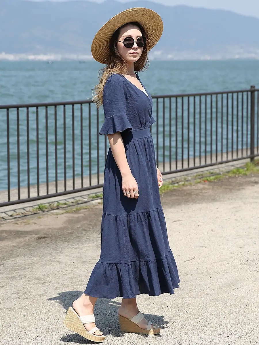 前後に深く開いた胸元のVカットがこなれ感を演出。1枚着るだけでおしゃれな印象となります。シルエットを変えたいときには、ベルトやリボンでウエストを絞る着用方法も。
