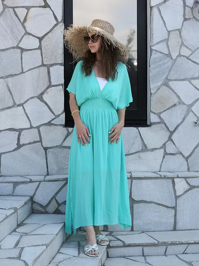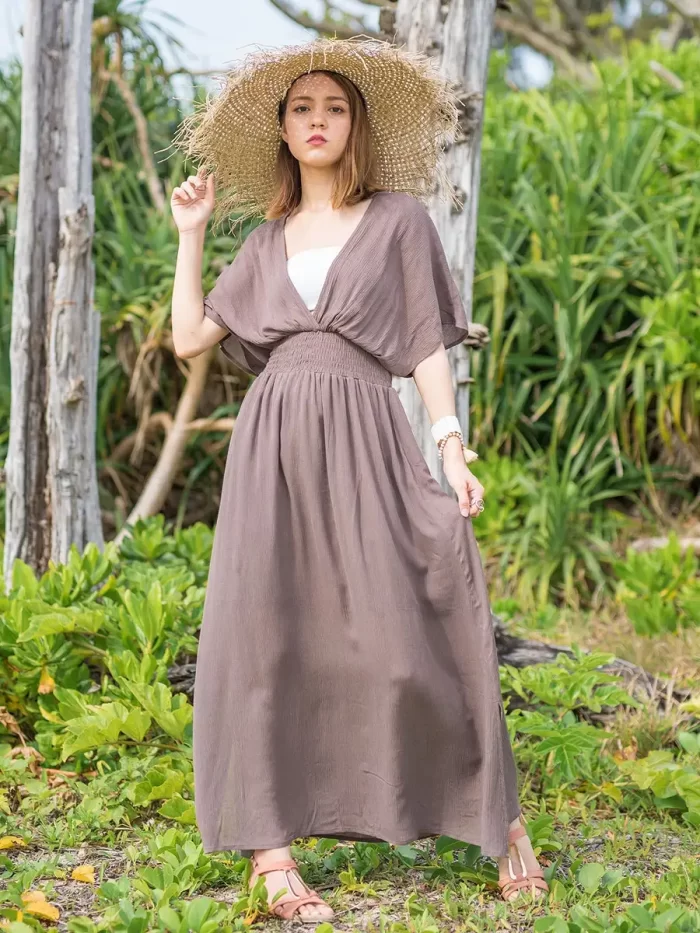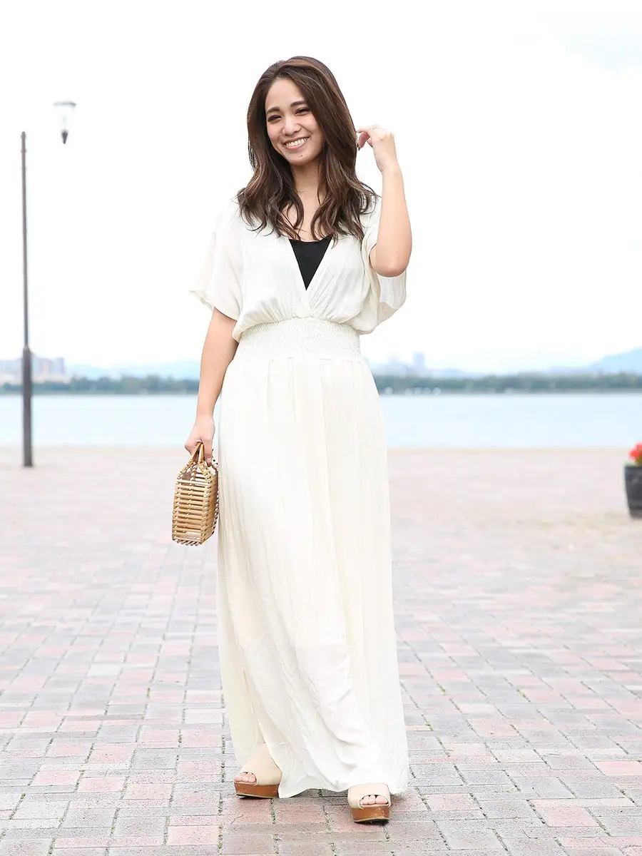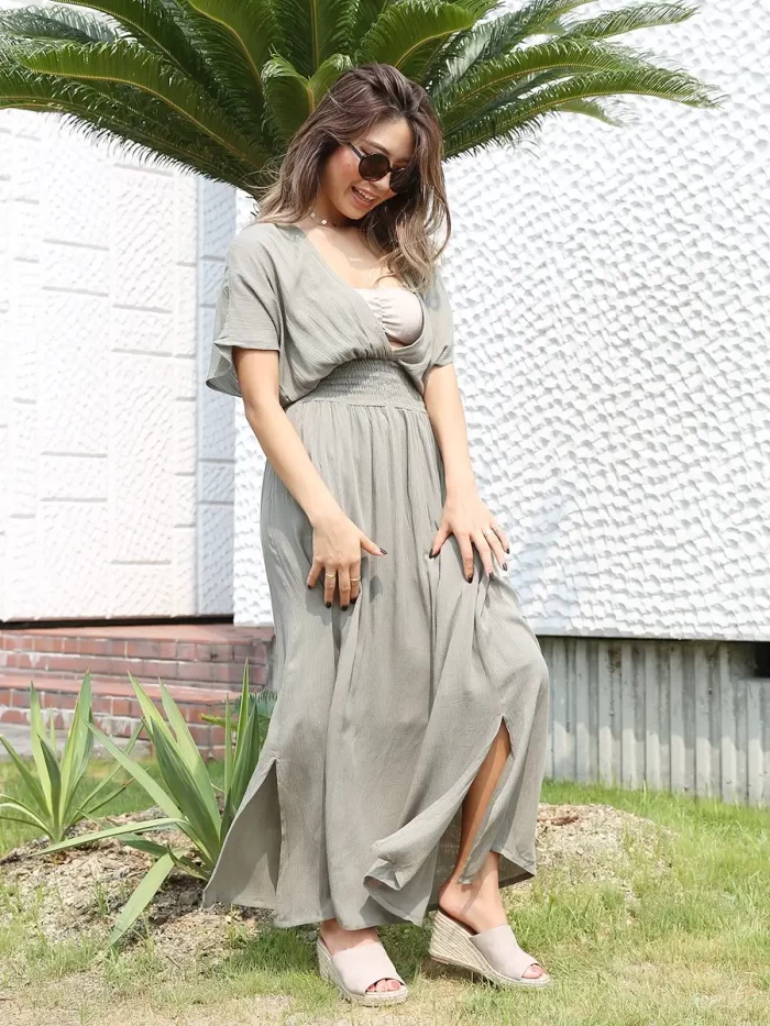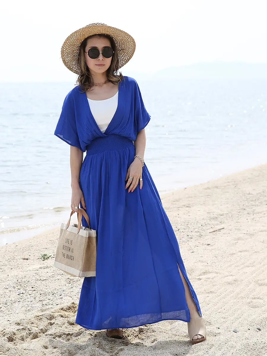 マキシ丈ワンピースは、長さがあるため動きにくい印象を持たれることもありますが、スリットがあることで軽やかな印象になります。歩くたびに動きが生まれ、リゾートらしい開放感を演出します。