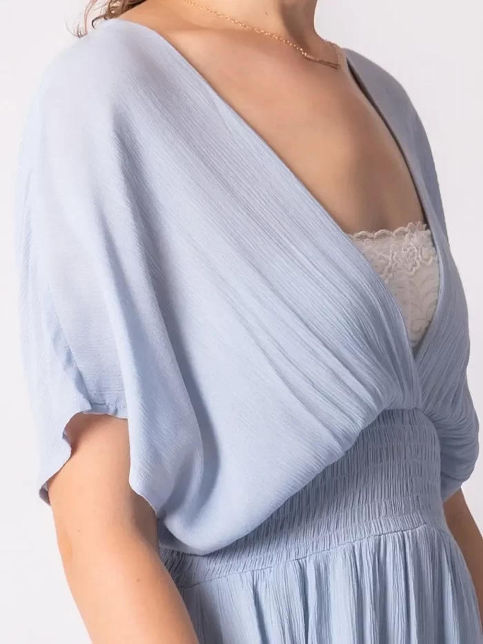 胸元は深めのVネックデザインで、デコルテラインをすっきり見せます。