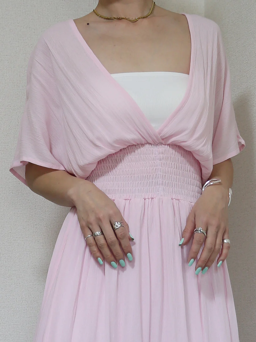 マキシ丈ワンピースは足元にボリュームが出やすいデザインですが、このデザインならVネックによって視線が縦に流れるため、全体のバランスがすっきり見える点も魅力です。ネックレスなどのアクセサリーとも合わせやすく、コーディネートの幅が広がります。