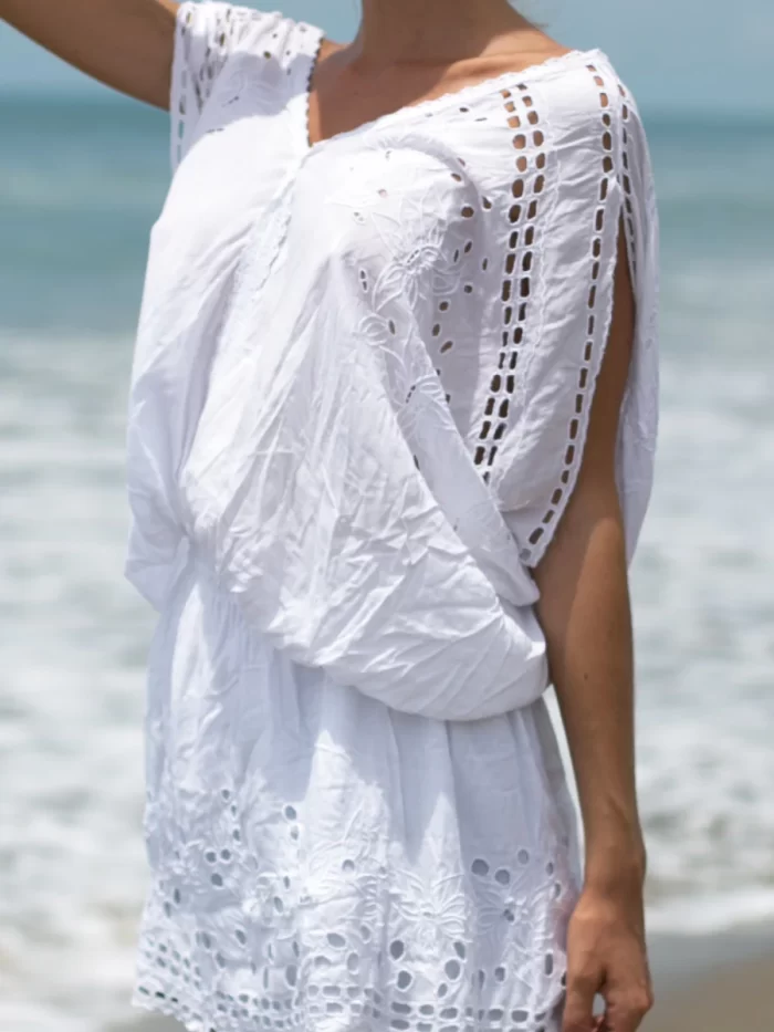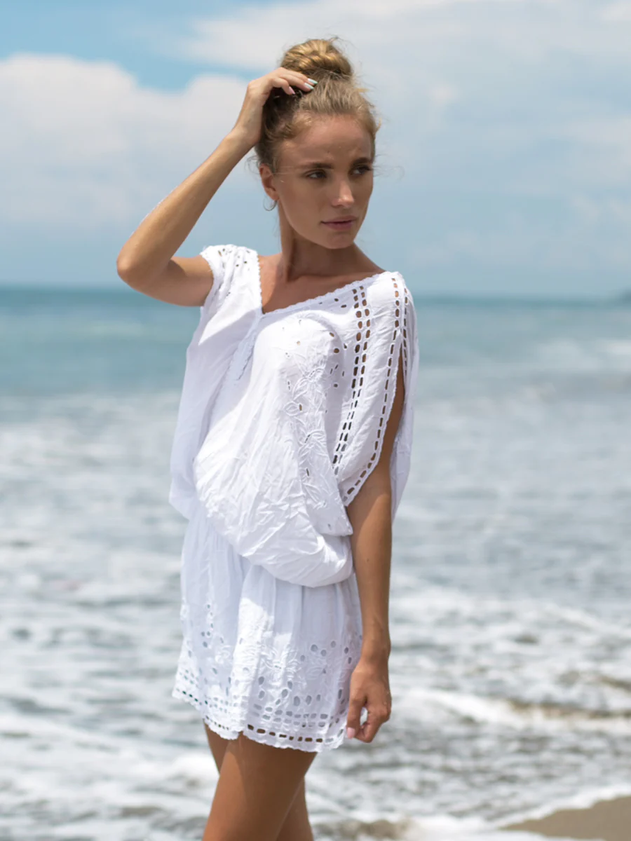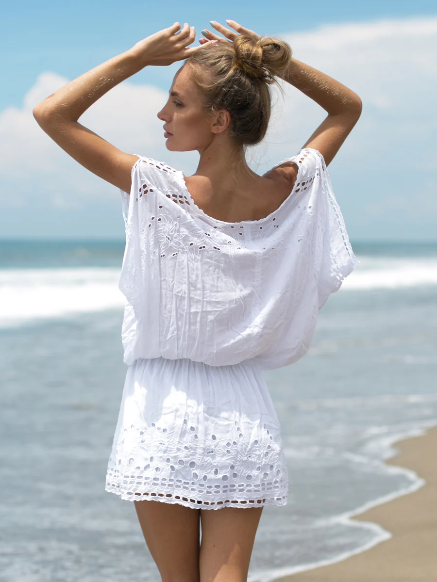 水着の上からさっと着ても可愛い、カットワーク刺繍が魅力のLAUT BLUE(ラウトブルー)のチュニックワンピース。ウエスト部分はゴム仕様で、丈の調節がしやすいデザインです。