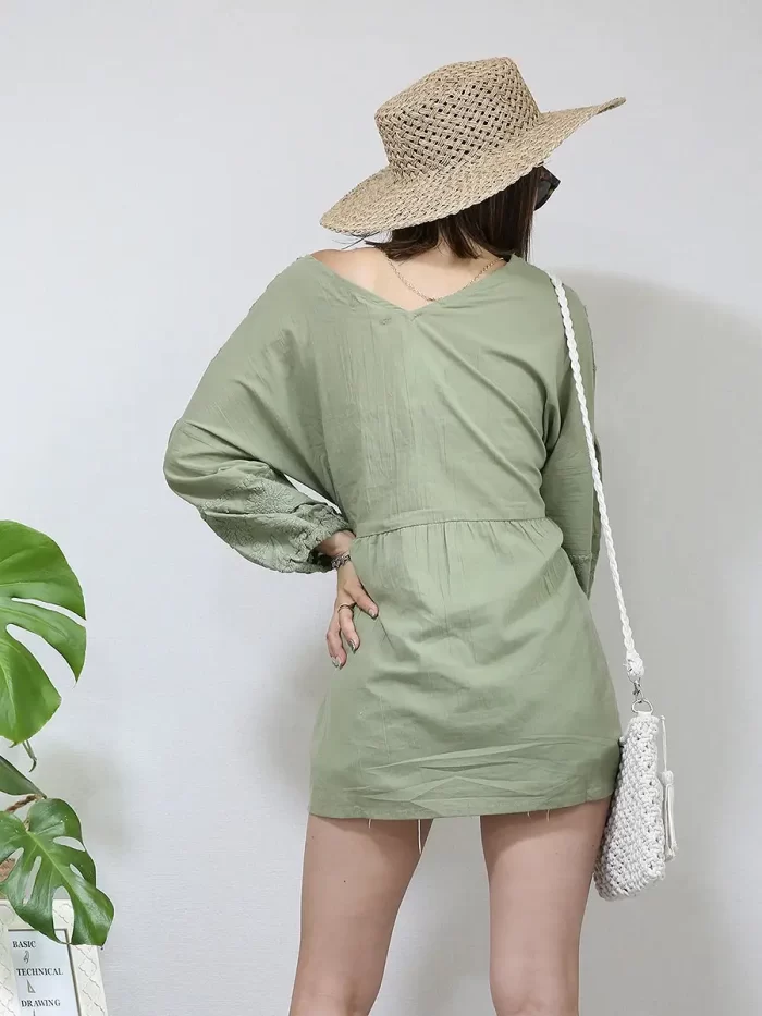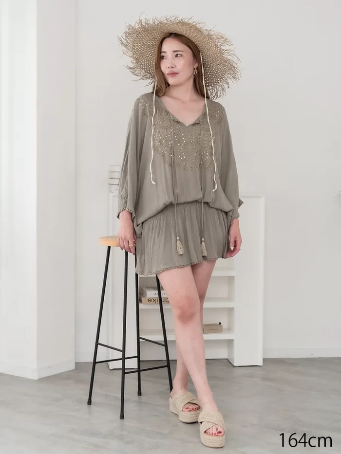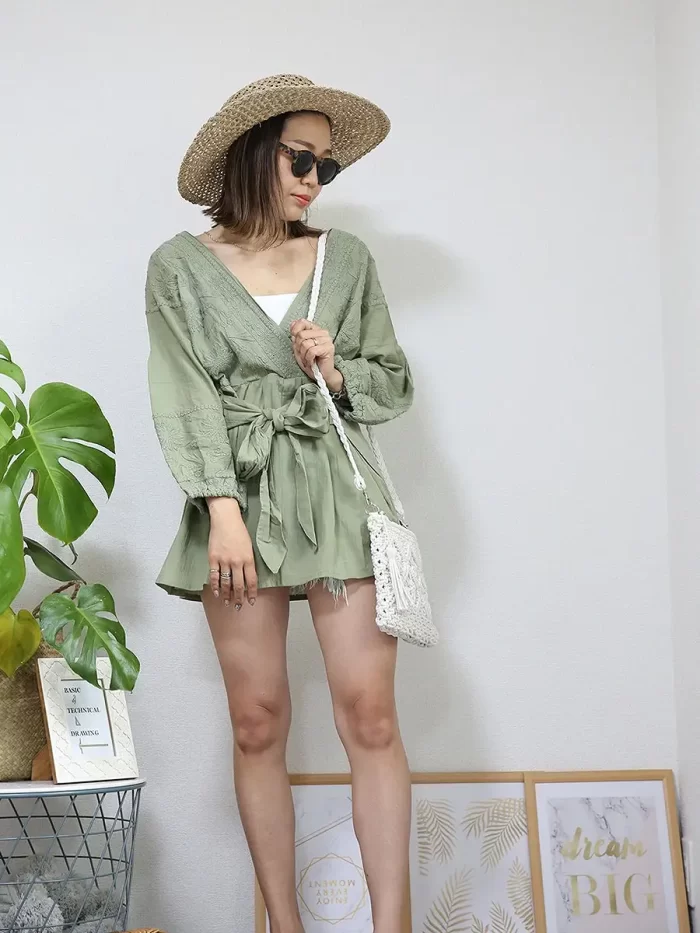 ショートパンツやスキニーパンツと合わせて着られるチュニックワンピースは、旅行先でアクティブに過ごしたい方におすすめ。動きやすさとリゾート感を両立できます。丈が短い分、ビーチで歩いても足元の砂が気になりにくく、1枚持っていると重宝します。