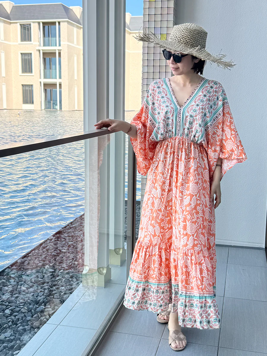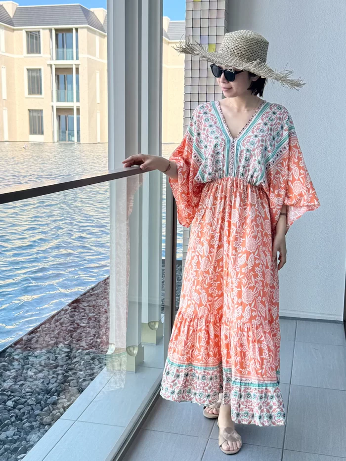 鮮やかなカラーリングで人気のroomy by the sea(ルーミー バイ ザ シー)の花柄マキシワンピース。リゾートシーンに映えるオレンジカラーとボタニカル柄が、夏のコーディネートを華やかに演出します。