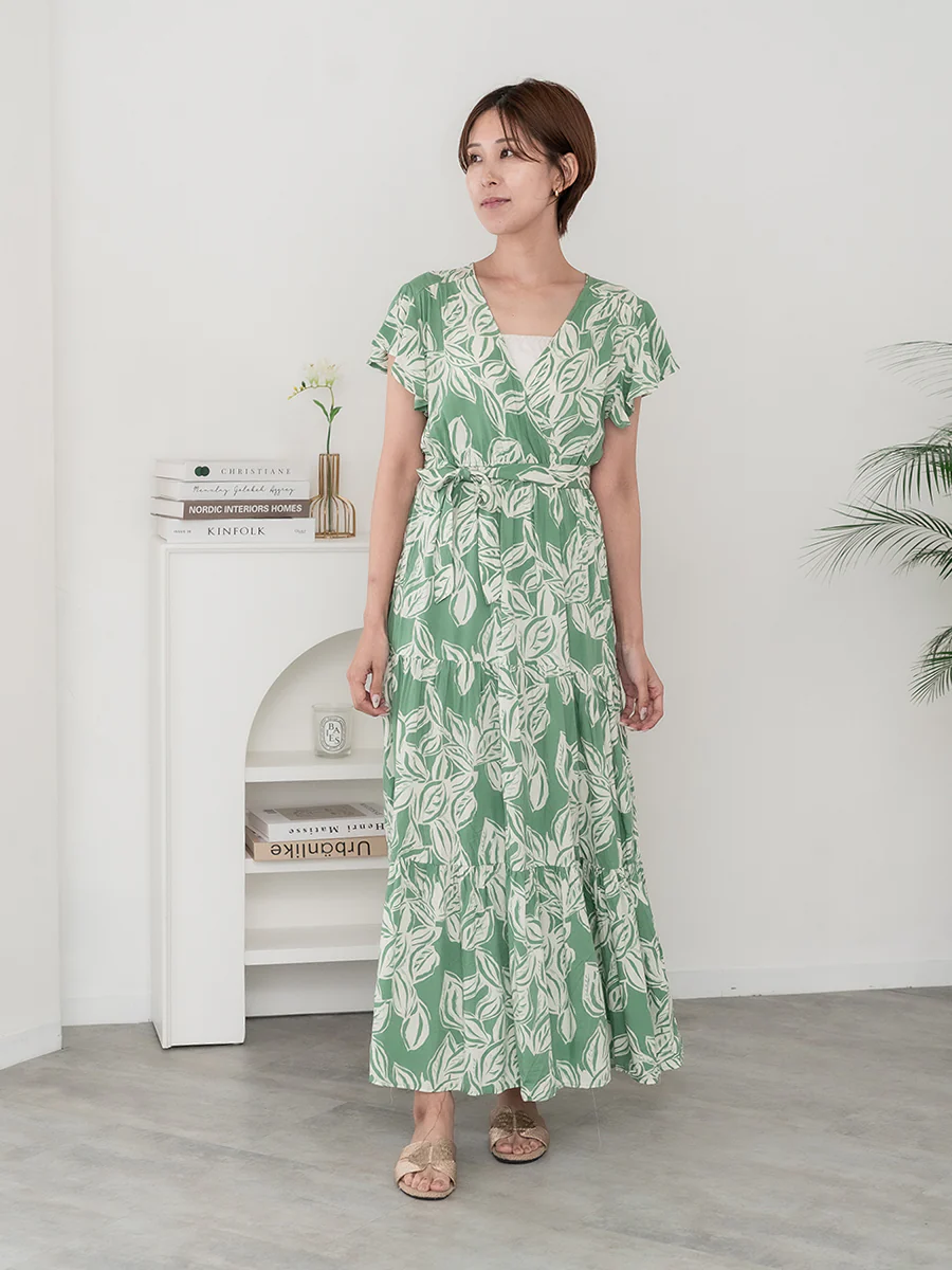上品さと清涼感を兼ね備えたグリーンが魅力で、くすみ感のあるカラーが大人にも挑戦しやすい一着です。存在感のある大きなモチーフが、コーディネートの主役になります。