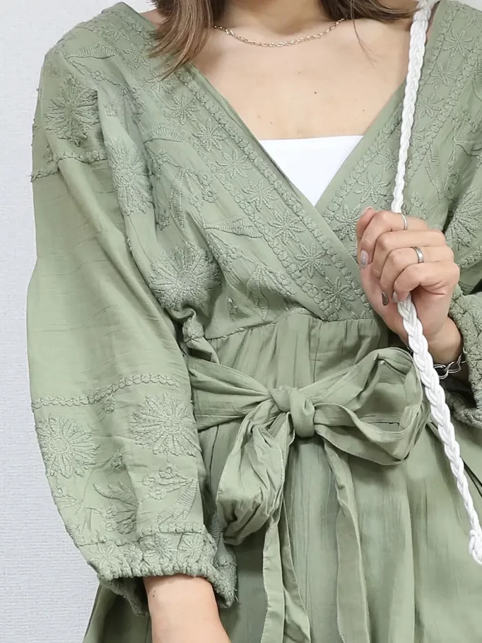 インド綿100%のコットン素材で、洗いやすく夏にぴったり。ウエストを絞って結ぶ大きなリボンがコーディネートのアクセントになります。立体感のある同色刺繍が施され、アクセサリーなしでも華やかな印象です。