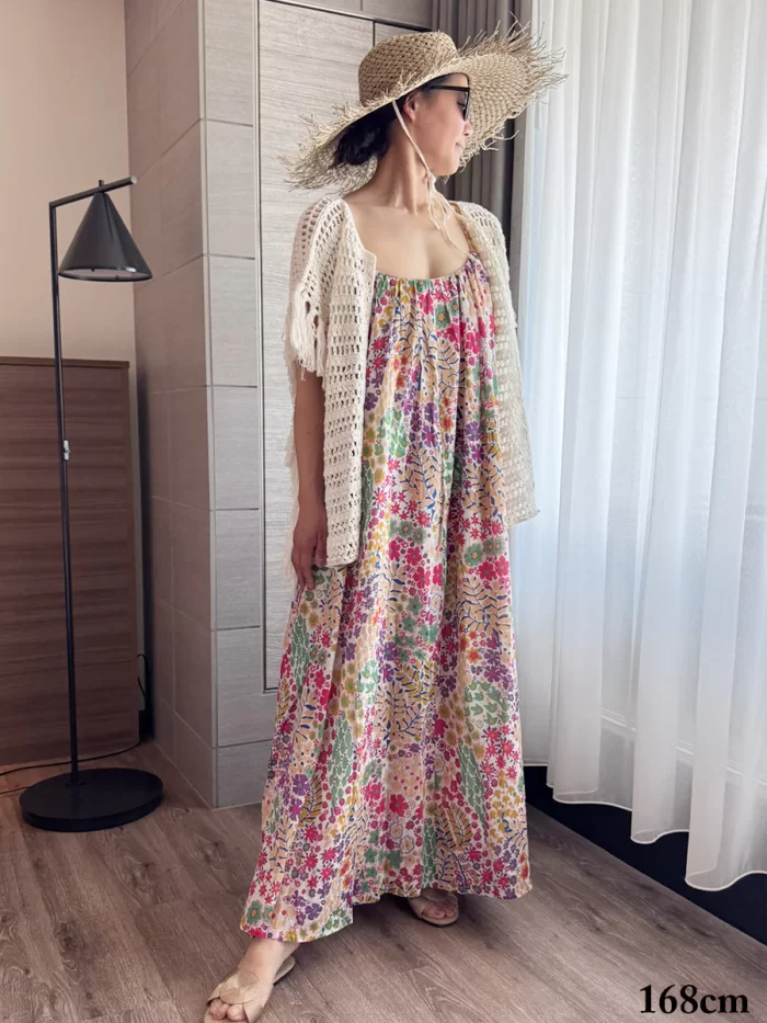 太めのベルトでウエストマークしたり、ロングカーディガンを羽織ったりと、着回し力も高め。デニムジャケットとブーツを合わせれば、初秋まで活躍します。リゾートだけでなく、普段使いもしやすい一着です。