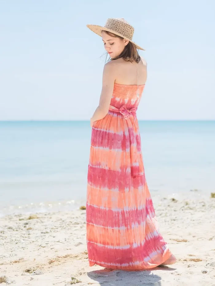 リゾート感あふれる明るいカラーが印象的なマキシワンピース。タイダイ染のボーダーも非日常感を演出してくれています。