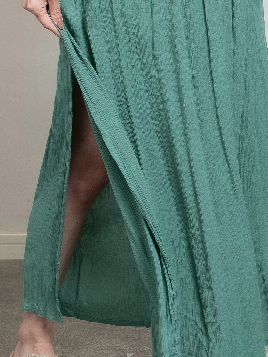 足元にスリットが入っていて、バックスタイルも含めると露出が多いように感じるかもしれませんが、落ち着いた印象のカラーがグッと大人の印象に引き上げてくれます。胸元にもビーズがきらりと光り、アクセサリーなしでも華やかな着こなしに。
