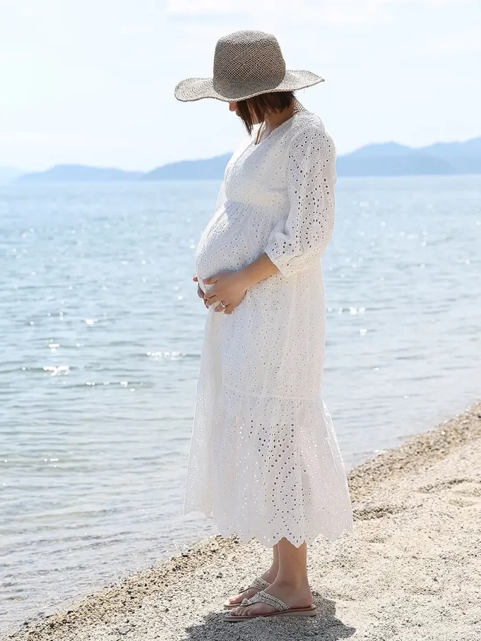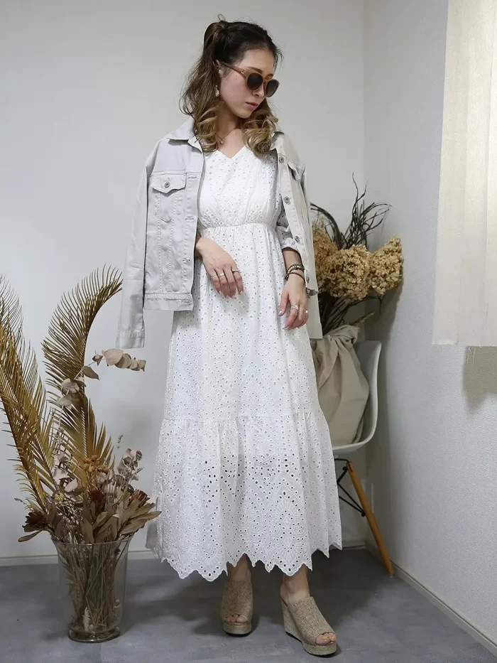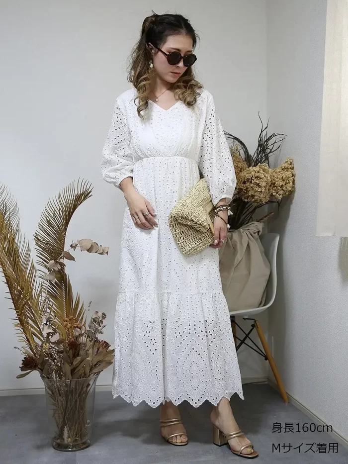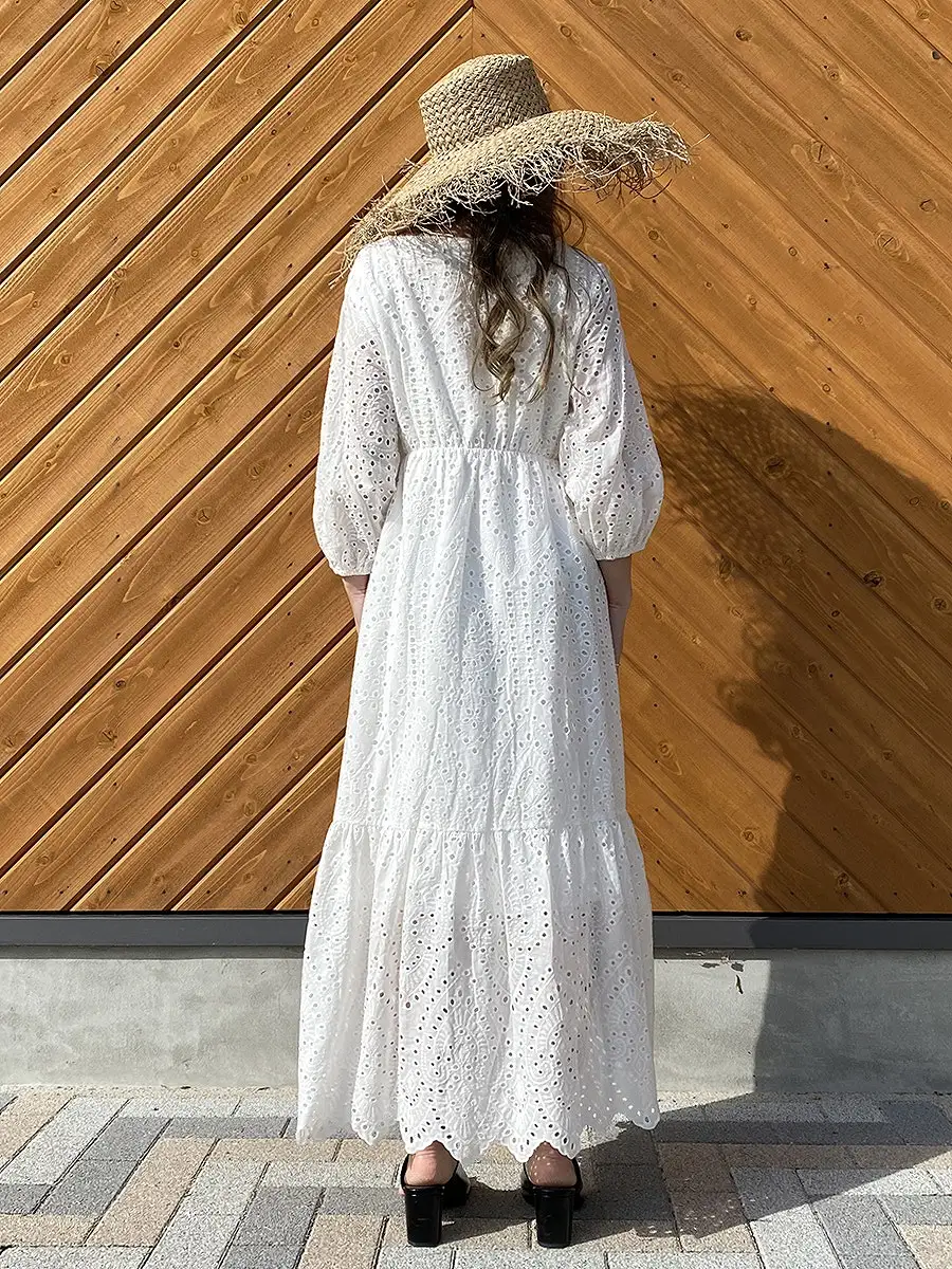 美しいシルエットが自慢の、ホワイトマキシワンピースです。全体にカットワーク刺繍が施されていて、高級感があります。