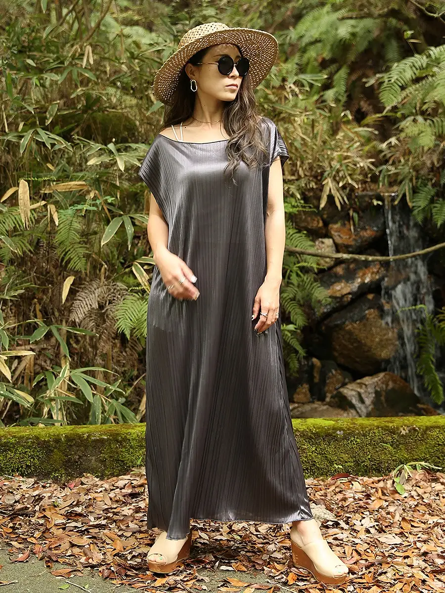 シルエットの美しさが特長であるブランド「roomy by the sea(ルーミーバイザシー)」のサテン調マキシワンピース。とろみのある落ち感が上品なワンピースです。