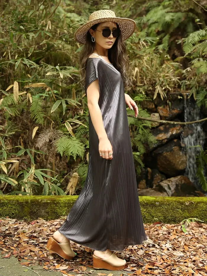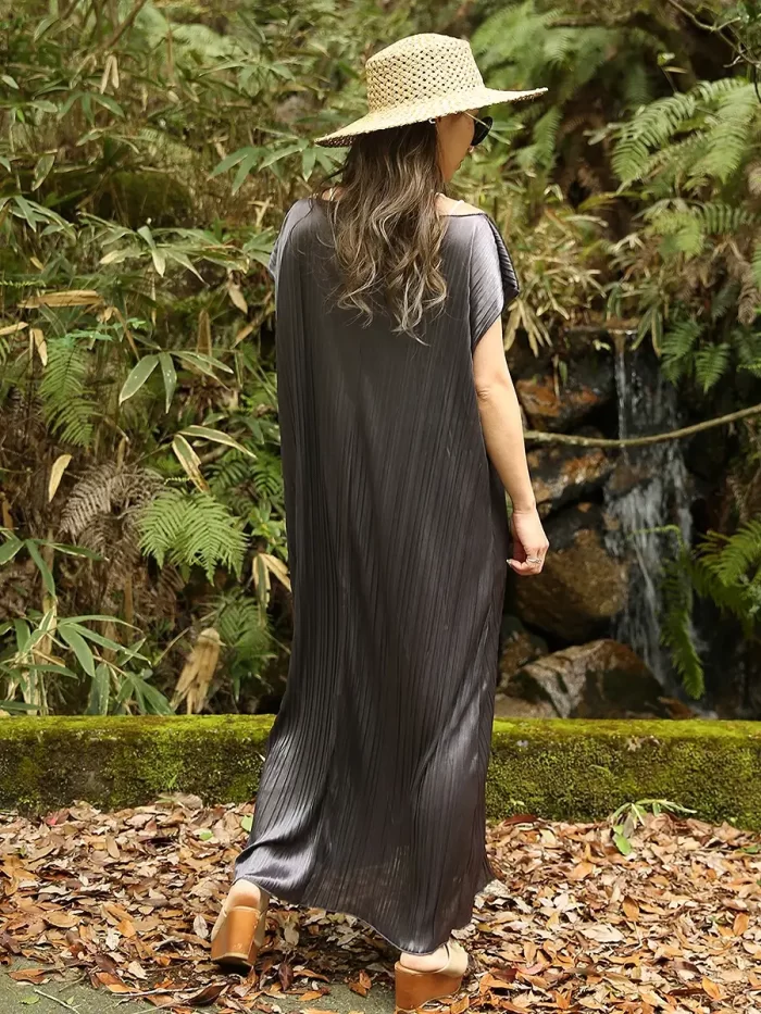 シックなカラーで晩夏~秋にもぴったり。ヒールの靴やブーツと合わせると、落ち着いた秋の装いになります。リゾートシーンだけでなく、レストランディナーにも着て行きたい1枚です。