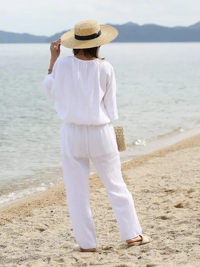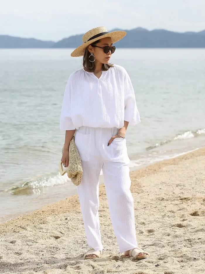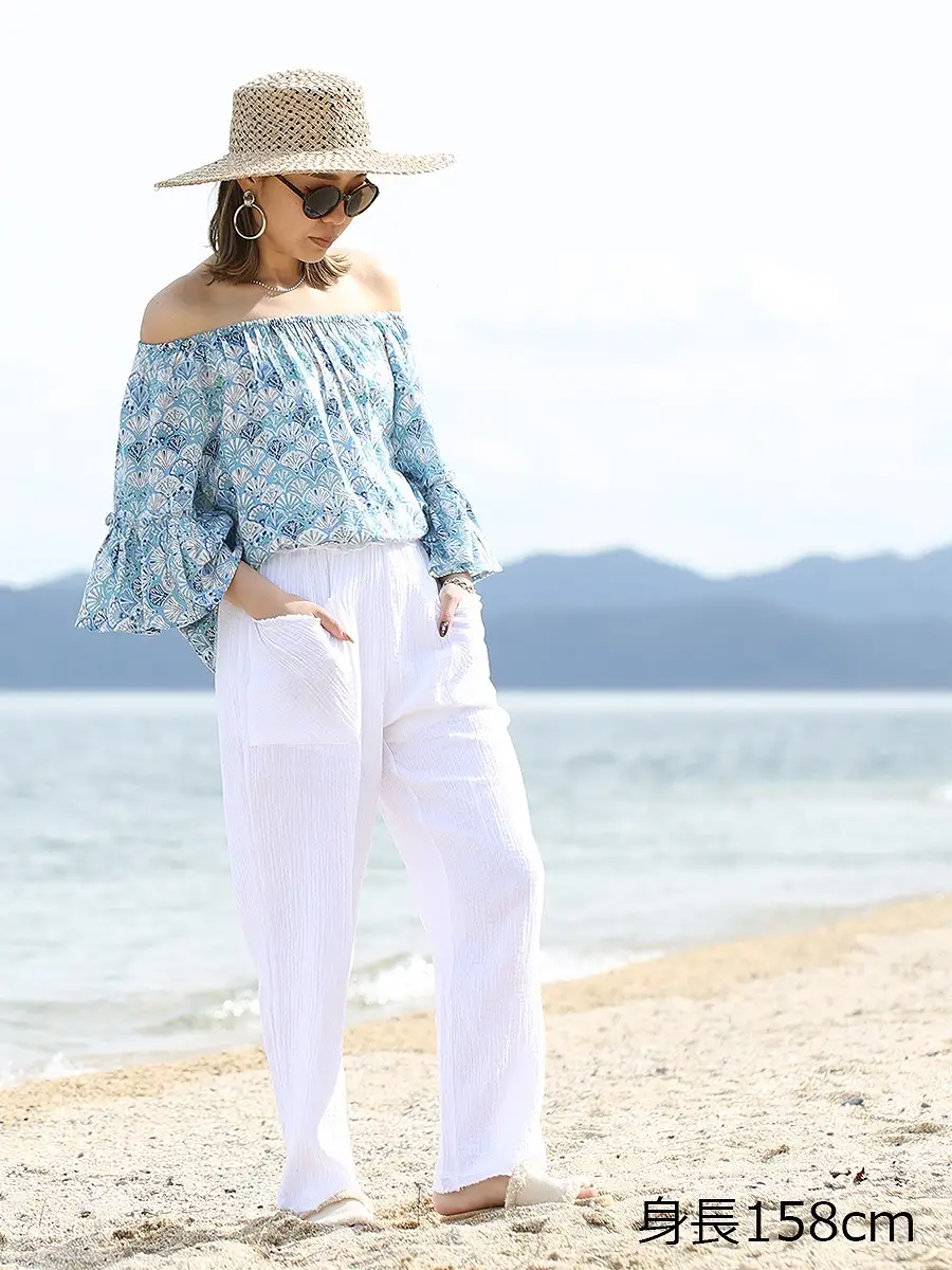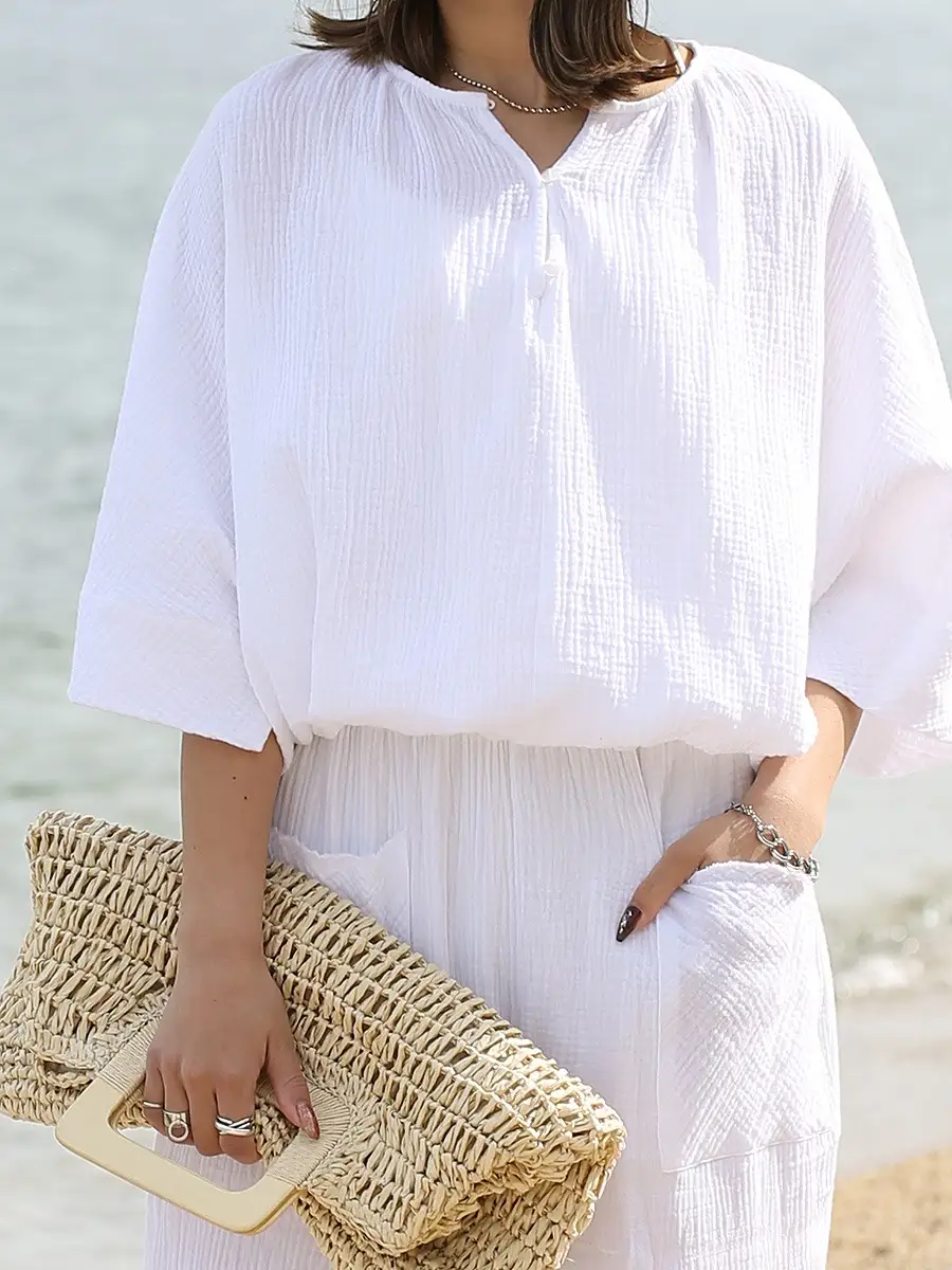 シボ感のあるコットン素材は肌触りがよく、汗ばむ時期でもさらりと着られるのでリゾートシーンにぴったりなアイテム。ビーチに映える白で、ビーチリゾートで着たい1枚です。