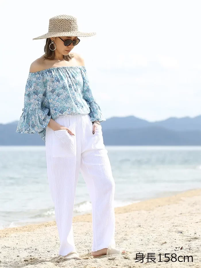 長袖のデザインなので、リゾートシーンでのUV対策や冷房対策にもぴったり。袖口にはゴムが入り、腕まくりに便利です。上着を着るときも袖が入り込んでしまうことなく、さらりと羽織れるのも嬉しいところ。